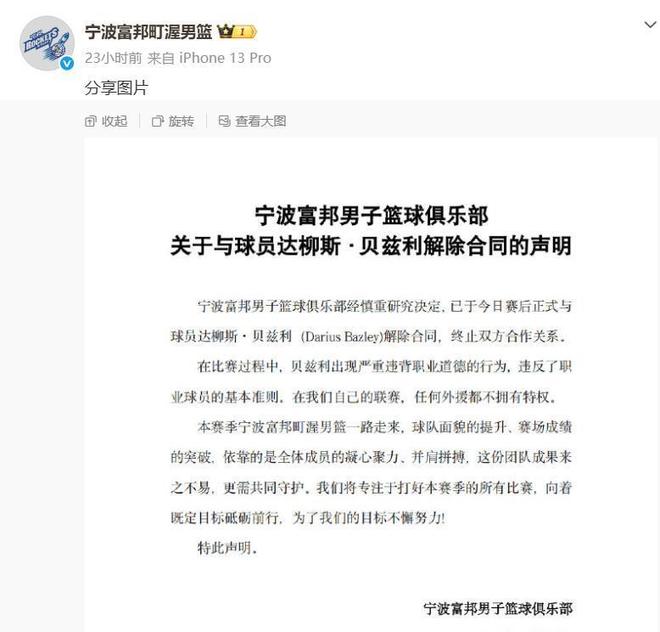 昨天晚上的比赛,宁波队在主场以97-119不敌上海队,送给上海队17连胜。这场比赛刚开始55秒宁波队就因为比赛失误等问题发生内讧,外援贝兹利先是推搡队友,随后又和主教练发生口头冲突,甚至出口辱骂宁波队的管理层和老板。球队方面也是当机立断,在当天晚上就宣布和贝兹利解除合同。总经理刘家成表示,不管是国内球员还是外援都不能破坏我们的团结,否则立马滚蛋。
